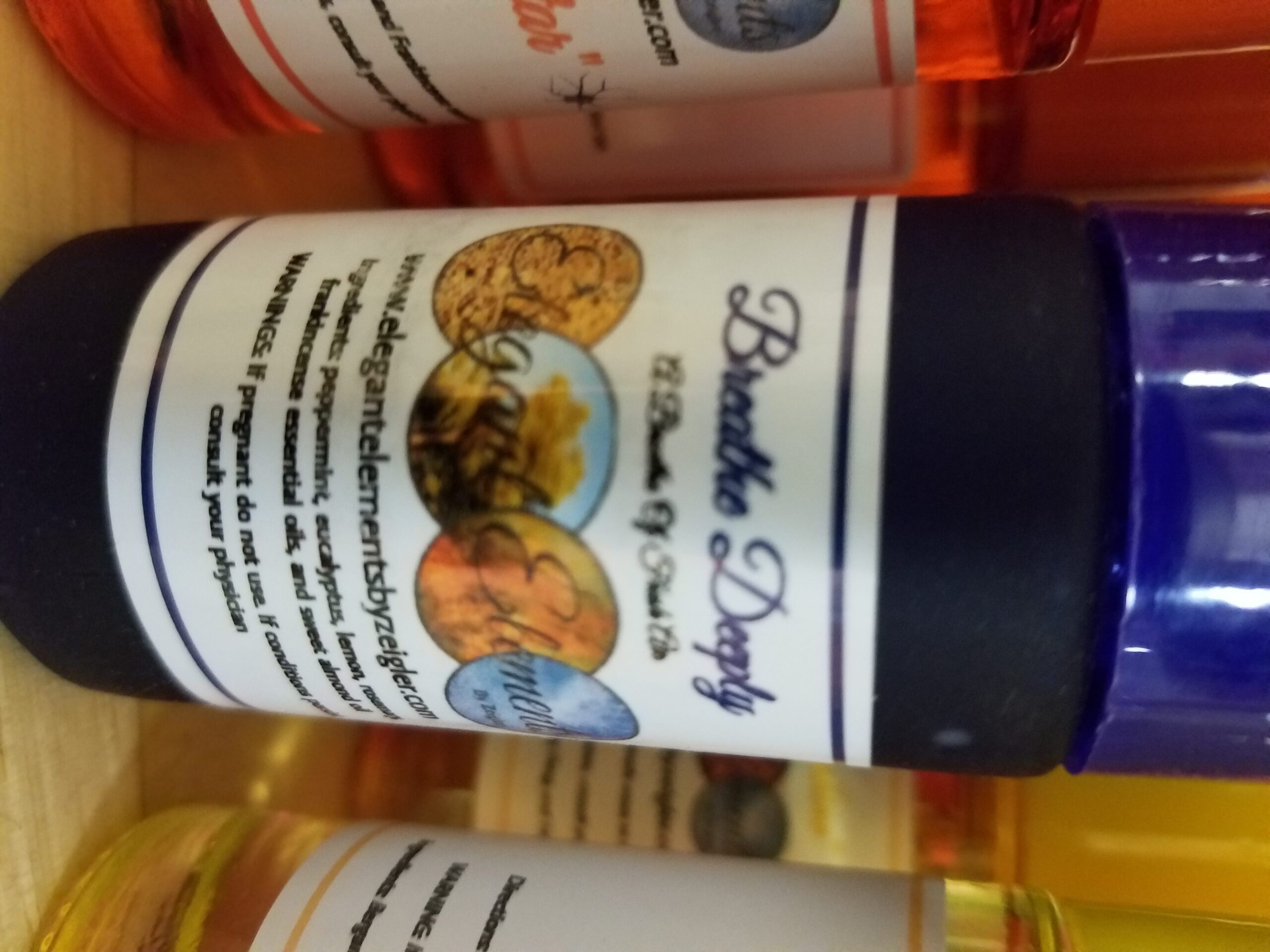 Oil Blend Breathe Deeply is to help with breathing issues. Ingredients: Peppermint, Eucalyptus. Lemon, Rosemary, and Frankincense.